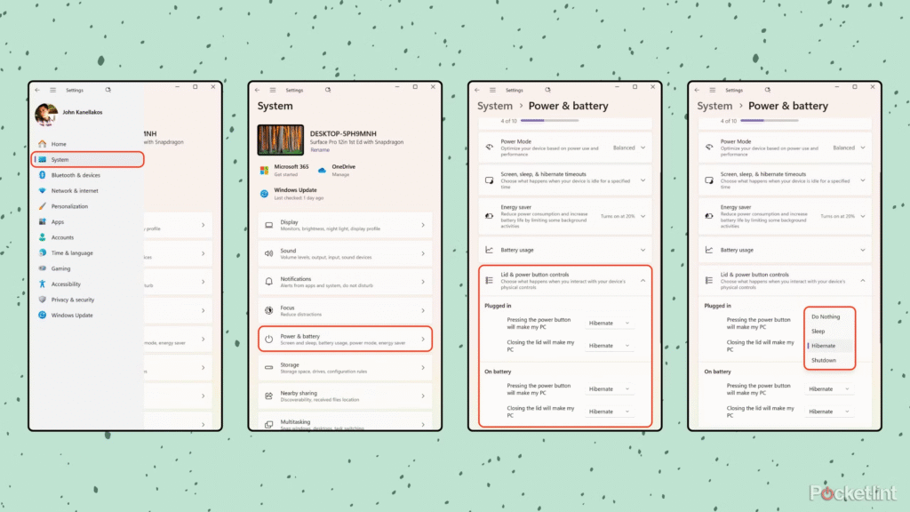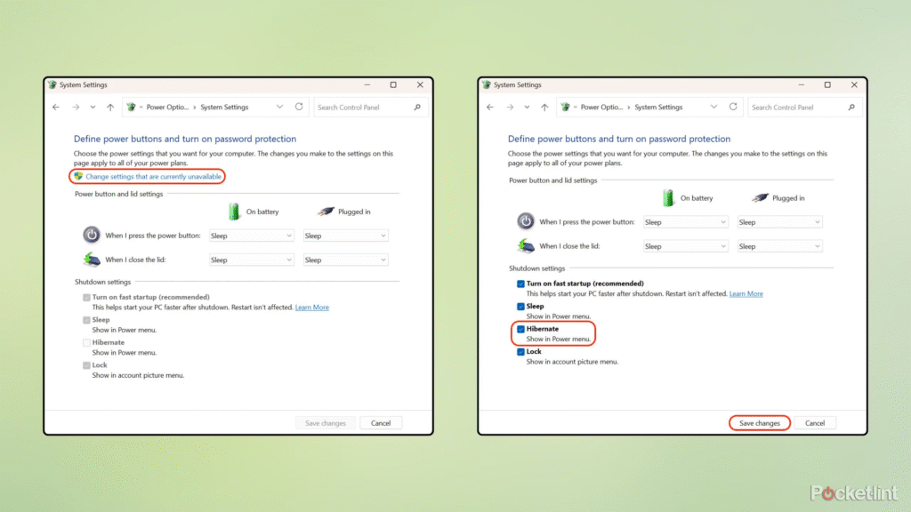 Chỉ cần chọn “Hibernate” từ các menu thả xuống tương ứng với hành động và trạng thái nguồn mong muốn. Các thay đổi sẽ được lưu tự động. Bất cứ lúc nào, bạn cũng có thể đảo ngược quá trình này và chuyển nút nguồn cũng như hành vi đóng nắp mặc định trở lại chế độ Ngủ (Sleep), vốn là cài đặt mặc định của Windows. Ngoài ra, nếu bạn muốn tắt hoàn toàn chế độ Ngủ đông, bạn có thể quay lại giao diện Control Panel cũ (như đã hướng dẫn ở Bước 2) và bỏ chọn tùy chọn Hibernate trong mục Cài đặt Tắt máy.